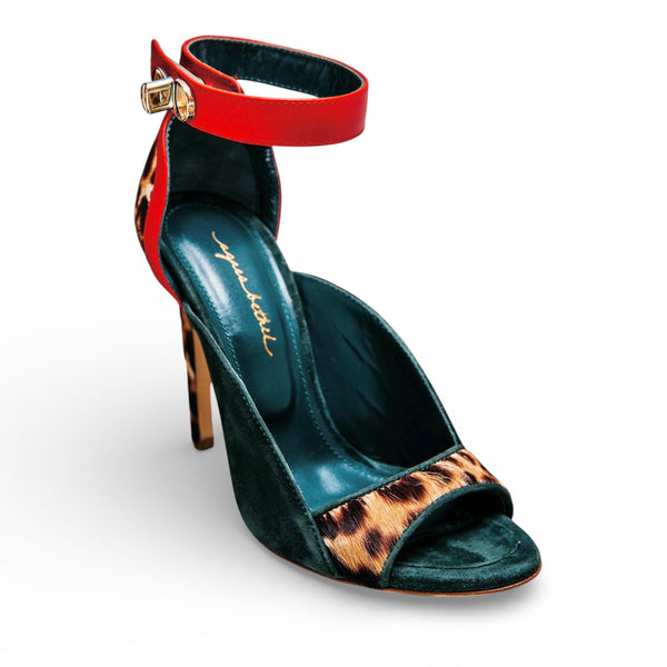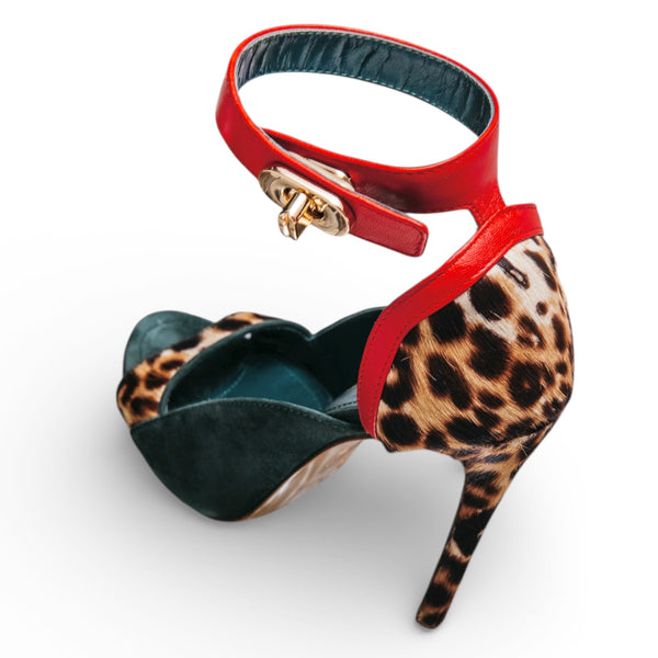 Dorothy Safari Rogue is not for the faint of heart. Reimagined on a wearable 100MM heel, this unapologetic silhouette takes the spirit of the original Dorothy and layers it in untamed luxury—featuring exotic leopard print calf hair, rich emerald green suede, and a crimson nappa ankle strap anchored by our signature gold lock.